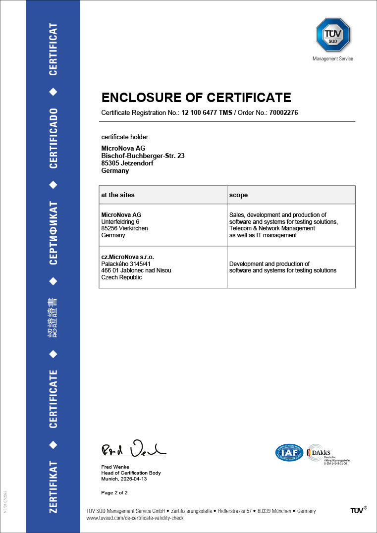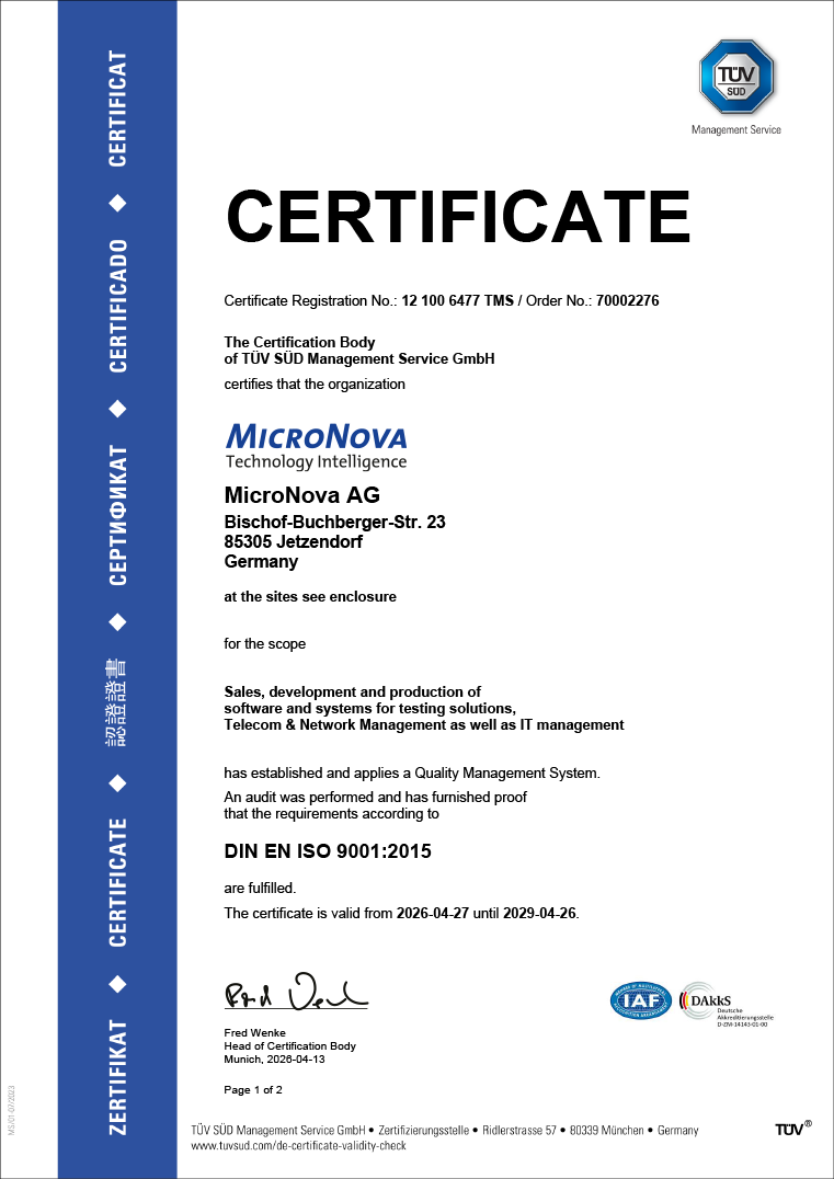 MicroNova AG, ks.MicroNova GmbH and cz.MicroNova s.r.o. are audited annually by the appropriate TÜV auditors. They regularly certify us with the ISO 9001 certificate that we are a competent, reliable and fair partner - with TÜV-approved quality management.